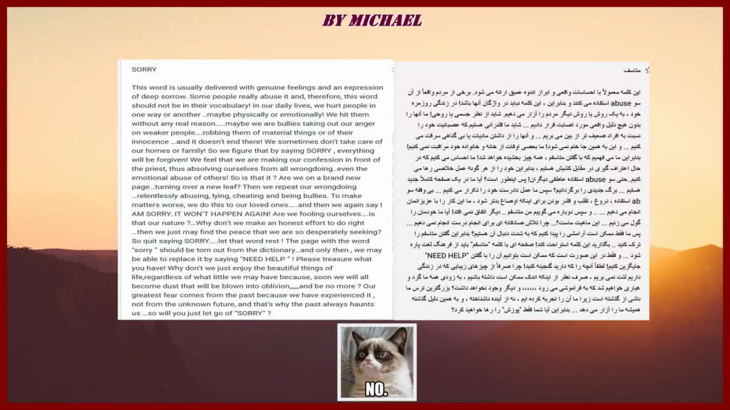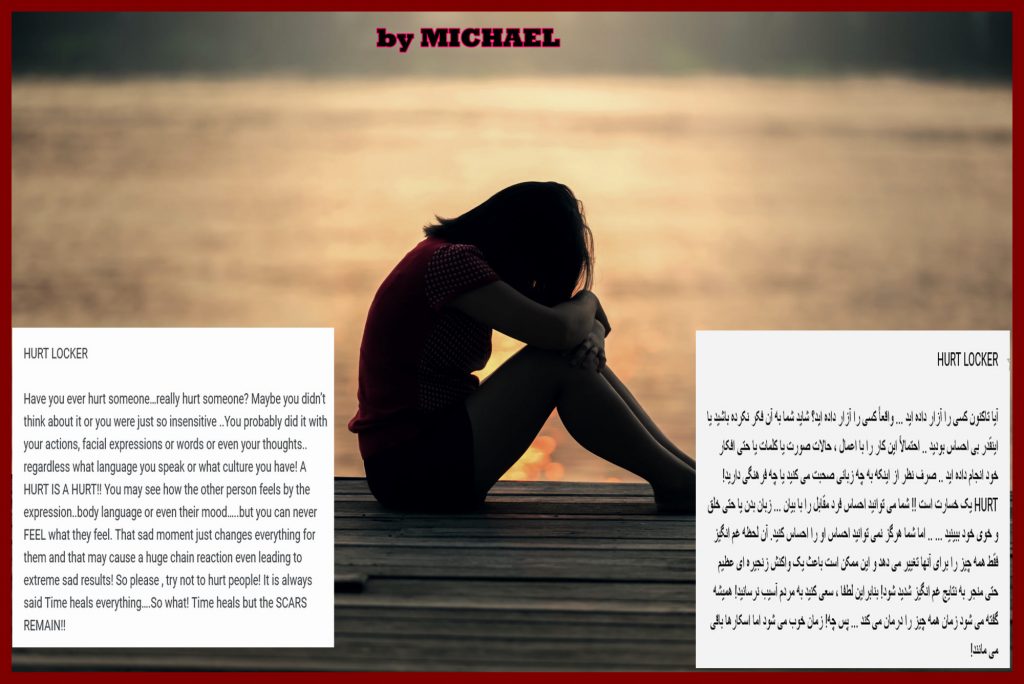 Loving someone means loving him whether he is ugly or nice on the outside; loving someone means loving him whether he is rich or poor; loving someone means loving him regardless of religion or beliefs; loving someone means loving him whether he is strong or weak or healthy or sick; loving someone means loving him whether he is in rags or well dressed; loving someone means loving him as he is , and not wanting to disassemble him and reassemble him in your way ; loving someone means loving him because he tells the truth , and not lie to please you ! If these don’t add up correctly, then you have the wrong number! (Michael). دوست داشتن کسی یعنی دوست داشتن او، چه از بیرون زشت باشد چه خوب؛ دوست داشتن کسی یعنی دوست داشتن او، چه ثروتمند باشد چه فقیر؛ دوست داشتن کسی یعنی دوست داشتن او صرف نظر از دین یا اعتقادات؛ دوست داشتن کسی یعنی دوست داشتن او، چه قوی باشد چه ضعیف، چه سالم باشد چه بیمار؛ دوست داشتن کسی یعنی دوست داشتن او، چه لباس پاره پوشیده باشد چه خوشپوش؛ دوست داشتن کسی یعنی دوست داشتن او همانطور که هست، و نخواستن او را از هم جدا کردن و دوباره به روش خودت سرهم کردن؛ دوست داشتن کسی یعنی دوست داشتن او به این دلیل که او حقیقت را میگوید و برای خوشامد تو دروغ نمیگوید! اگر اینها به درستی با هم جور در نمیآیند، پس شماره را اشتباه گرفتهای! (مایکل).